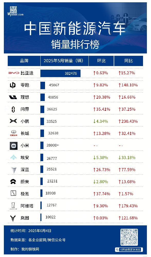 據Mysteel不完全統計,截至2025年6月4日,13家主流車(chē)企發(fā)布2025年5月新能源汽車(chē)銷(xiāo)量數據,11家車(chē)企實(shí)現同比正增長(cháng)。