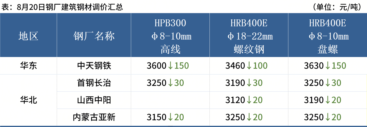 ◎ 8月20日,中天鋼鐵出臺8月下旬價(jià)格,螺紋鋼下調100元/噸,線(xiàn)材盤(pán)螺下調150元/噸。