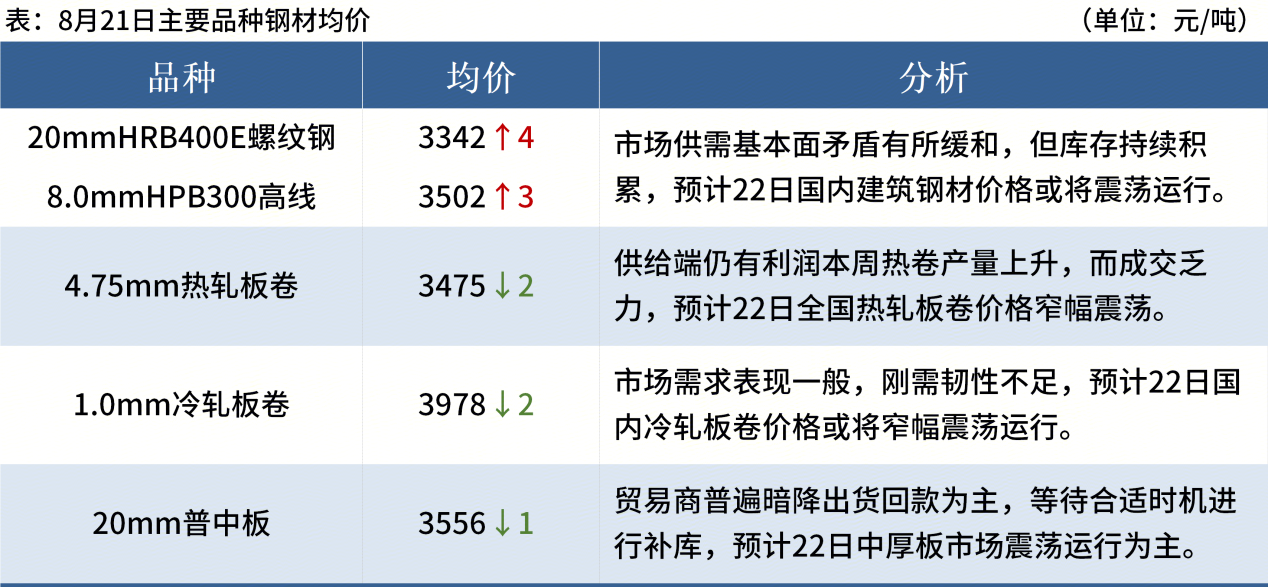 ◎ 8月21日,全國主港鐵礦石成交91.70萬(wàn)噸,環(huán)比減22.9%;237家主流貿易商建筑鋼材成交9.35萬(wàn)噸,環(huán)比減8.5%。