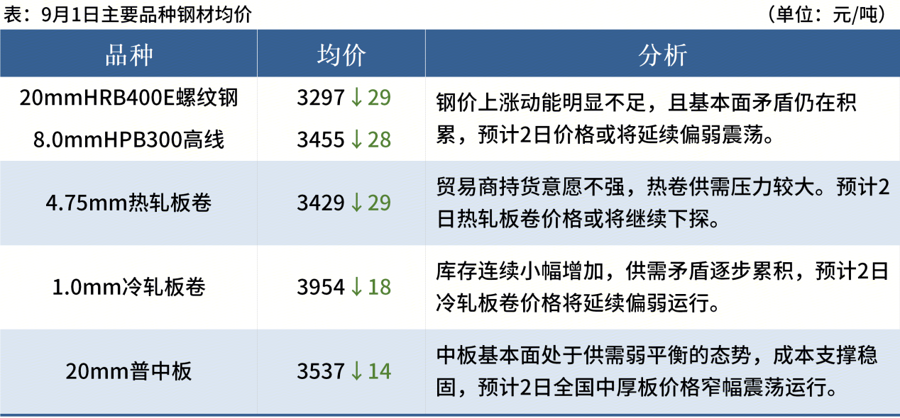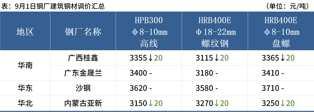 ◎ 9月1日,中天鋼鐵出臺9月上旬價(jià)格,螺紋鋼、線(xiàn)材、盤(pán)螺價(jià)格持平。華東螺紋鋼3400元/噸、線(xiàn)材盤(pán)螺3600元/噸。