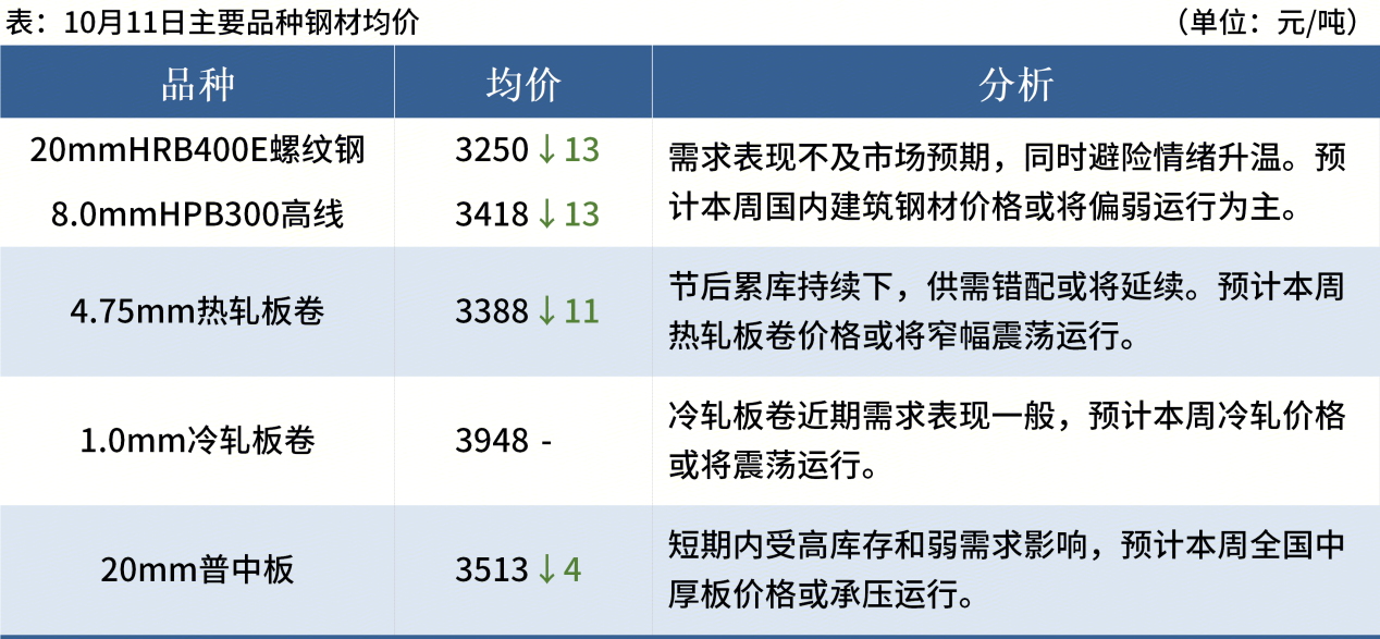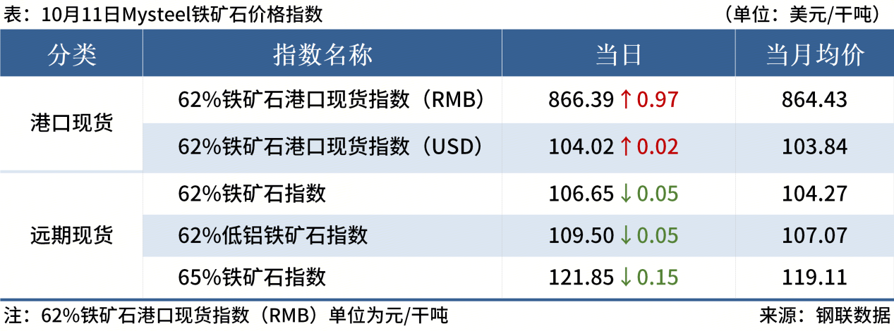 ◎ 10月11日,全國主港鐵礦石成交50.60萬(wàn)噸,環(huán)比減58.3%;237家主流貿易商建筑鋼材成交9.14萬(wàn)噸,環(huán)比減7.1%。
