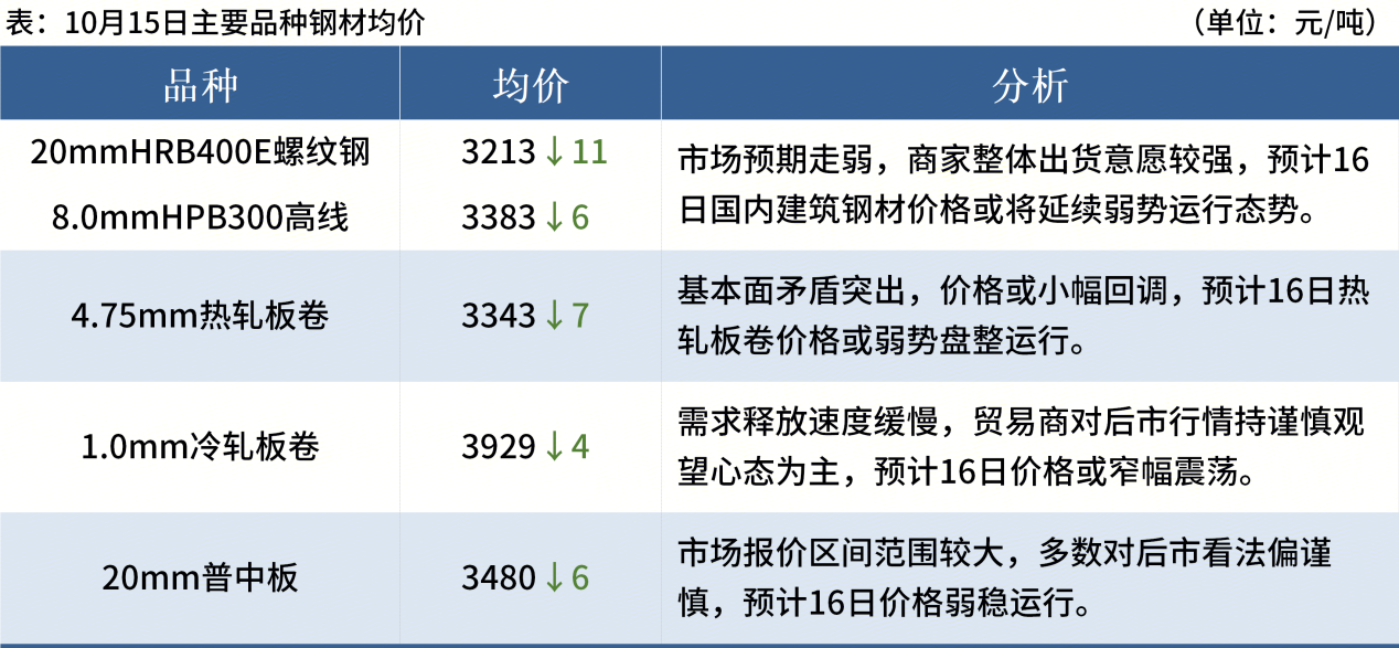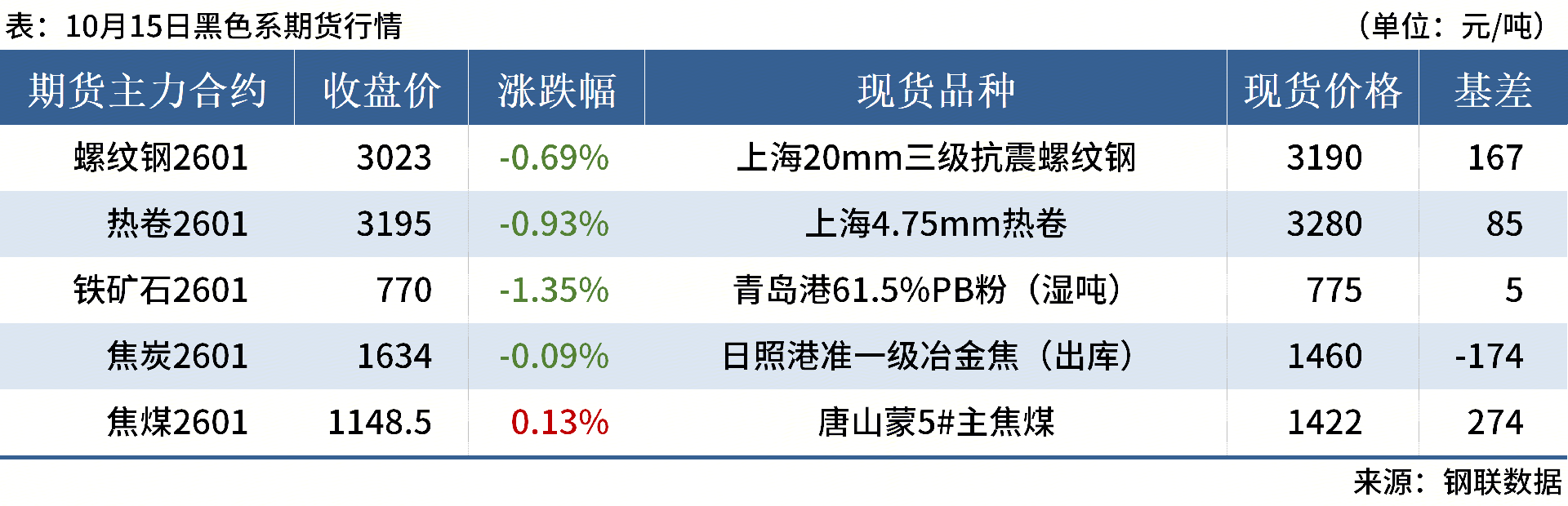 ◎ 10月15日,全國主港鐵礦石成交124.40萬(wàn)噸,環(huán)比減33.1%;237家主流貿易商建筑鋼材成交9.14萬(wàn)噸,環(huán)比減3.4%。